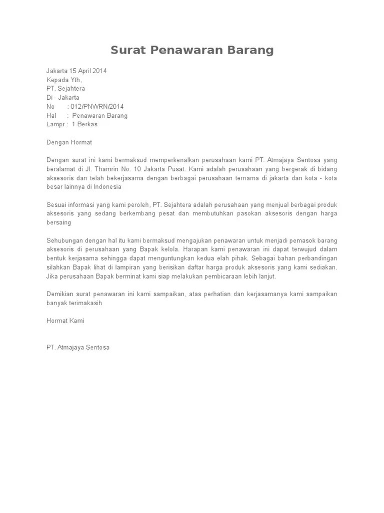 Contoh surat penawaran harga, barang, pengadaan, kerjasama, jasa, pengajuan, proposal penawaran, download file word doc contoh surat penawaran kerjasa. Poin pertama yang perlu dicantumkan dalam surat penawaran barang dan harga ini adalah informasi singkat mengenai perusahaan kita. Surat penawaran harga barang biasanya digunakan oleh perusahaan atau bisnis usaha dalam menawarkan barang beserta rincian harganya kepada . Contoh surat penawaran harga, barang, kerjasama, jasa, resmi, rumah, tanah, barang elektronik yang baik dan benar lengkap Gatot subroto no 5 kel.
